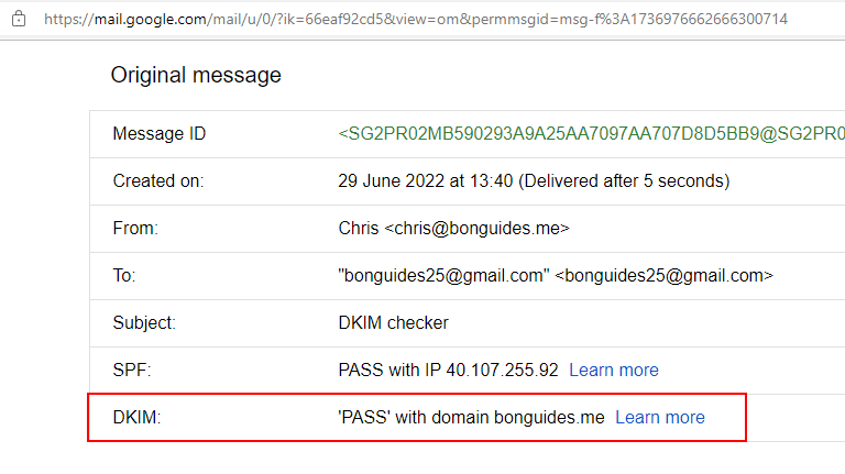 3. The original email would be opened in a new tab, in here you can see the DKIM signature for your domain is configured correctly or not.